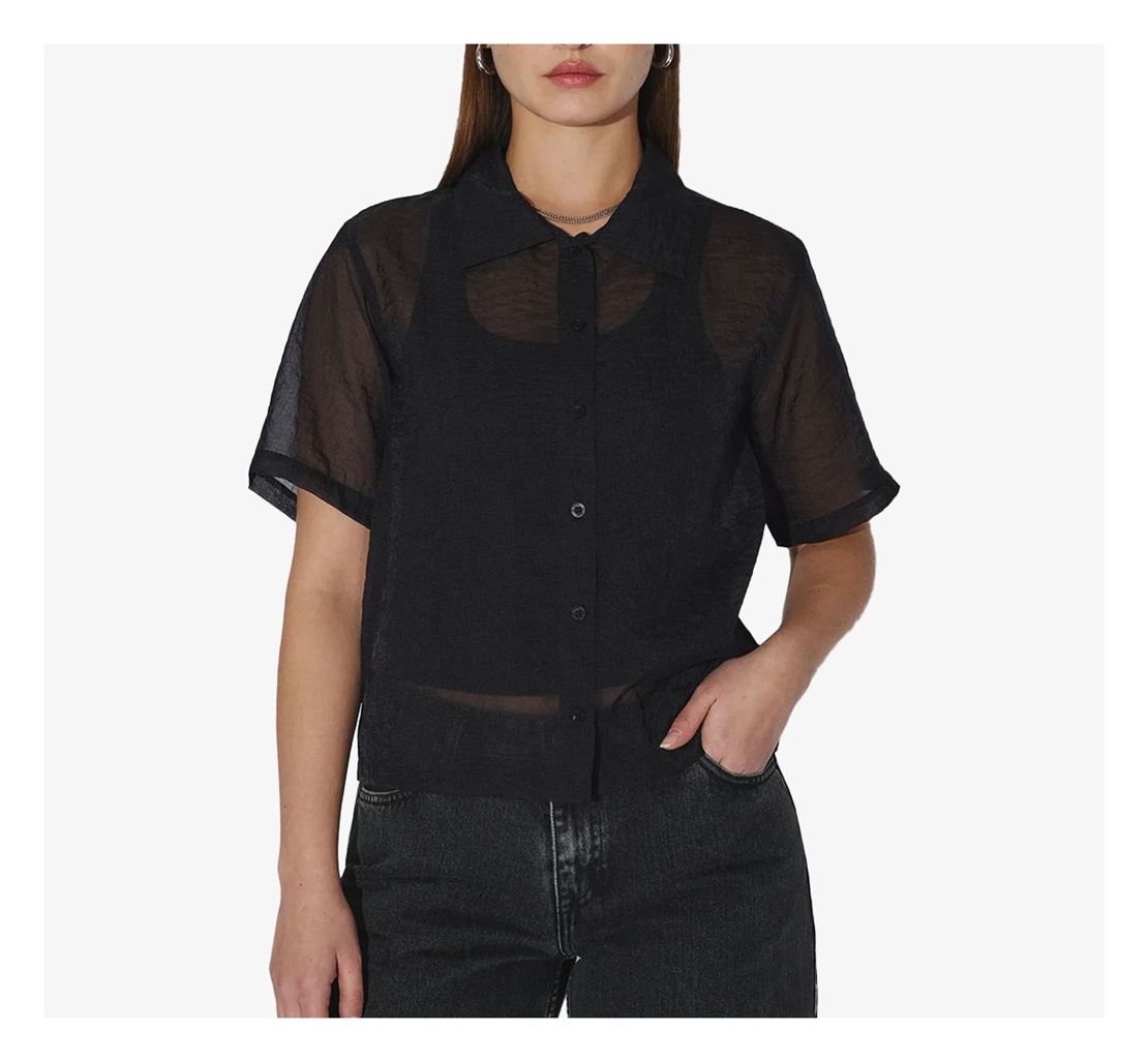 Das kurzärmlige Hemd mit Knopfleiste und breitem Kragen in Schwarz vereint stylischen und eleganten Look. Der durchscheinende Ripstop-Stoff macht es zum besonderen Piece.