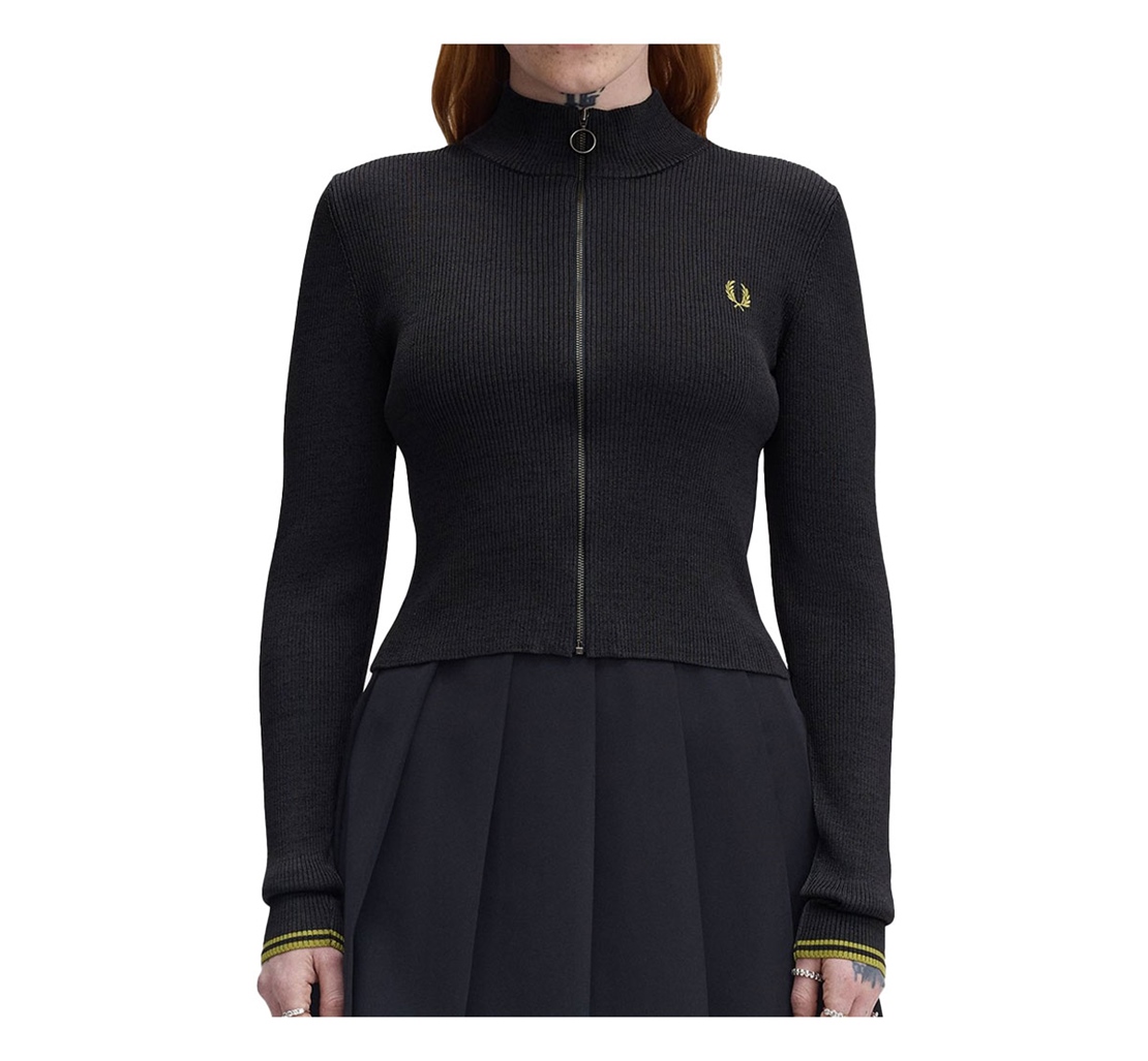 Der gerippte Pullover besteht aus vollständig recycelten Materialien mit einem dezenten Metallic-Look, der bei jeder Bewerung das Licht einfängt. Er ist mit passendem Neon-Doppelfaden und gesticktem Lorbeerkranz verziert und verfügt über einen Ringschieber am Reißverschluss, der einen Hauch von Nostalgie versprüht.