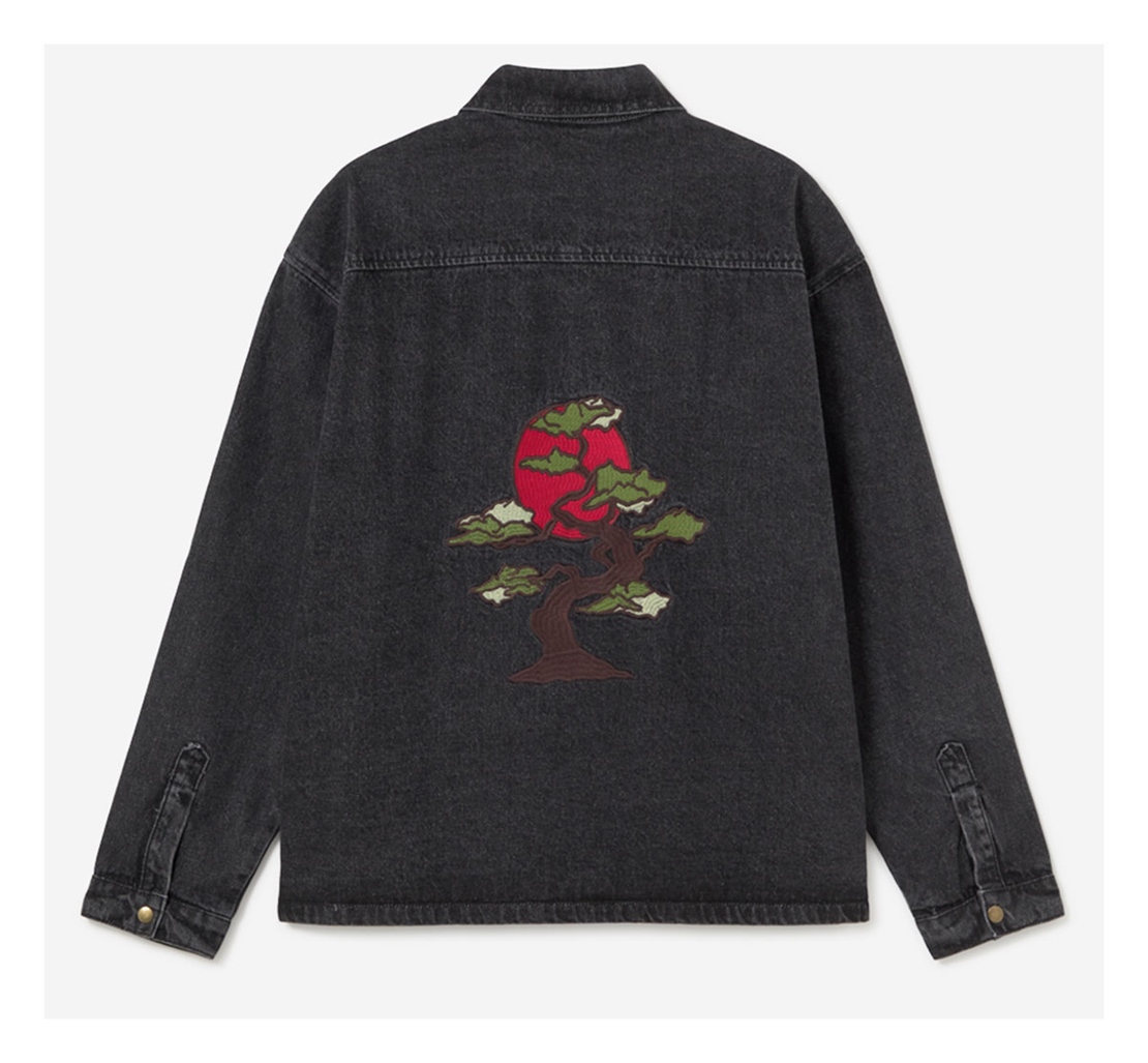 Die Denim-Jacke von Kaotiko Society in Washed Black mit aufwendiger Bonsai-Baum-Stickerei auf der Rückseite. Die Stickerei zeigt einen stilisierten Bonsai vor roter Sonne im japanischen Stil. Mit klassischem Hemdblusenkragen, durchgehender Knopfleiste und zwei Eingrifftaschen vorne.