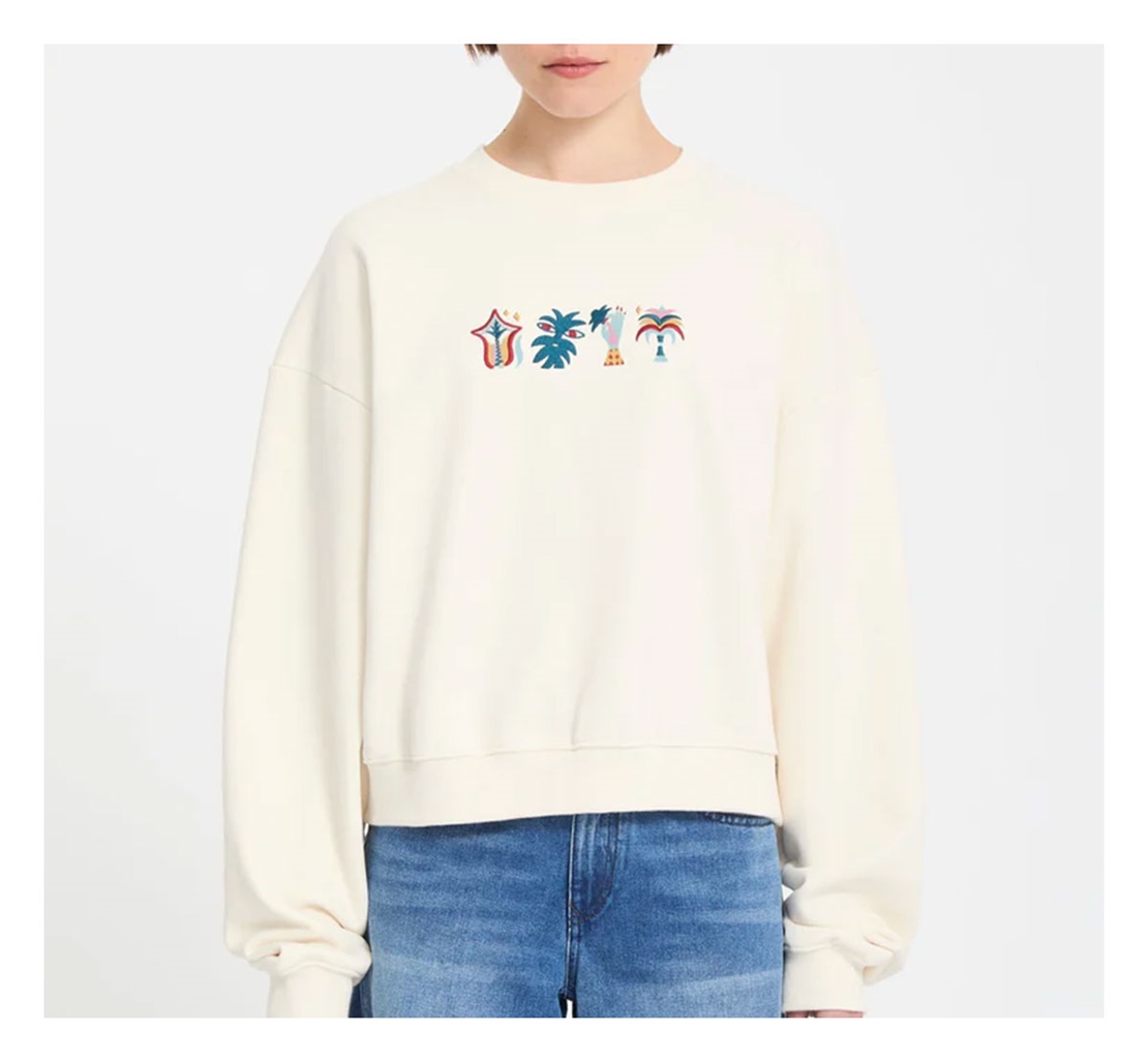 Sweatshirt für Frauen im Loose Fit mit Rundhalsausschnitt, Rippstrick-Bund und -bündchen. Featured Artist Siebdruck und Stickereien vorne in der Mitte und am Rücken. Mit Label des Künstlers an der Seitennaht. Artwork von Featured Artist Bruno Lucas.